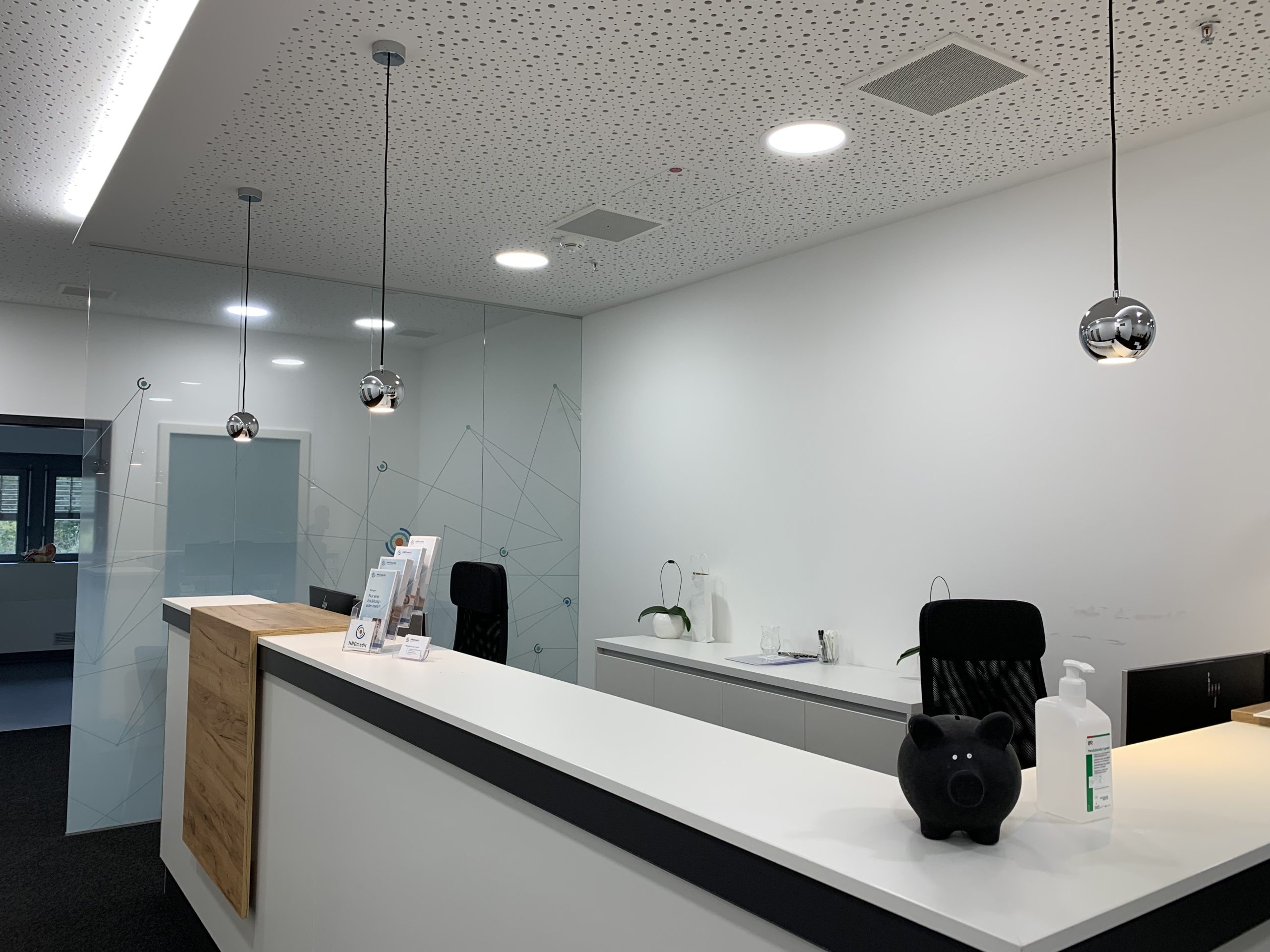 Die Praxis wird ergonomisch und effizient gestaltet, mit einem einladenden Empfangsbereich, einem komfortablen Wartezimmer, modern ausgestatteten Behandlungsräumen und funktionalen Büros. Es werden hochwertige Materialien wie robuste Bodenbeläge, schallisolierte Wände und ergonomische Möbel verwendet. Zudem wird eine moderne technische Ausstattung installiert, darunter Klimaanlagen, IT-Infrastruktur und Medizintechnik.